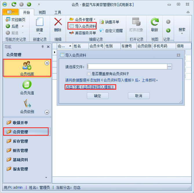 ②下載軟件中的會員檔案模板。點擊【會員管理】→【會員檔案】→“導(dǎo)入會員資料”→點擊下載《會員資料導(dǎo)入模板》,如圖: