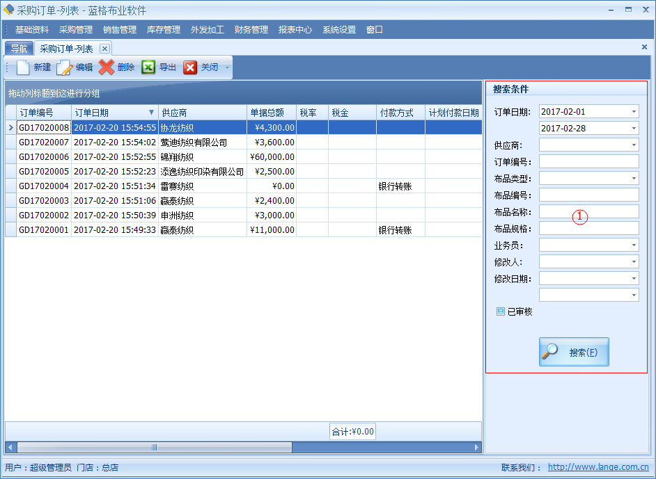 ○1 通過訂單編號(hào)或者供應(yīng)商,布品名稱等方式快速查詢數(shù)據(jù)。 如下圖: