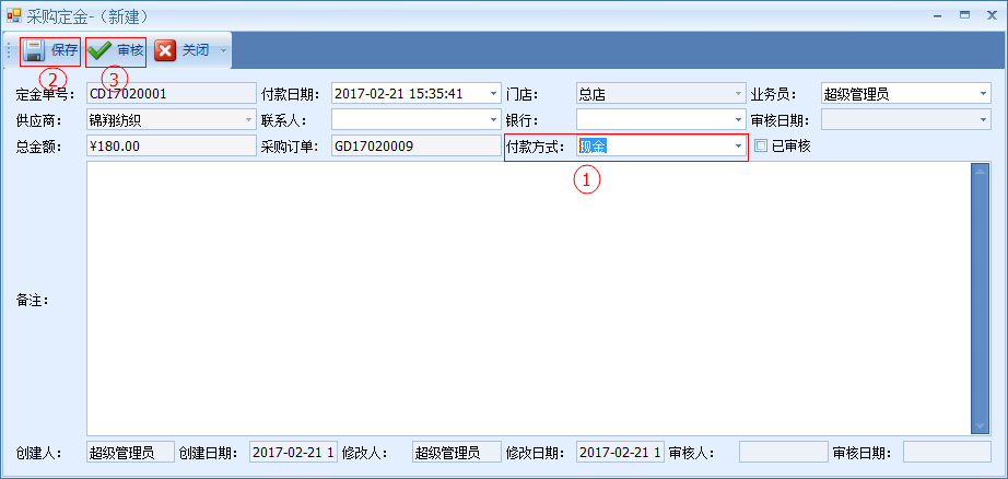 ○1 選擇一個(gè)付款方式 ○2 保存 ○3 審核