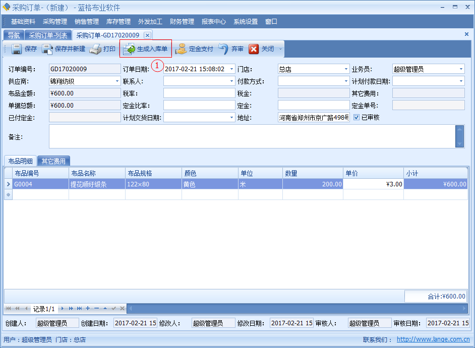【采購(gòu)訂單】中記錄了開單日期、供應(yīng)商、供應(yīng)商聯(lián)系人、交貨日期、付款日期、付款方式、金額、定金、稅率、稅金等信息。明細(xì)數(shù)據(jù)中是該單據(jù)采購(gòu)布品名稱,顏色,單位,數(shù)量?jī)r(jià)格等詳細(xì)數(shù)據(jù)。
