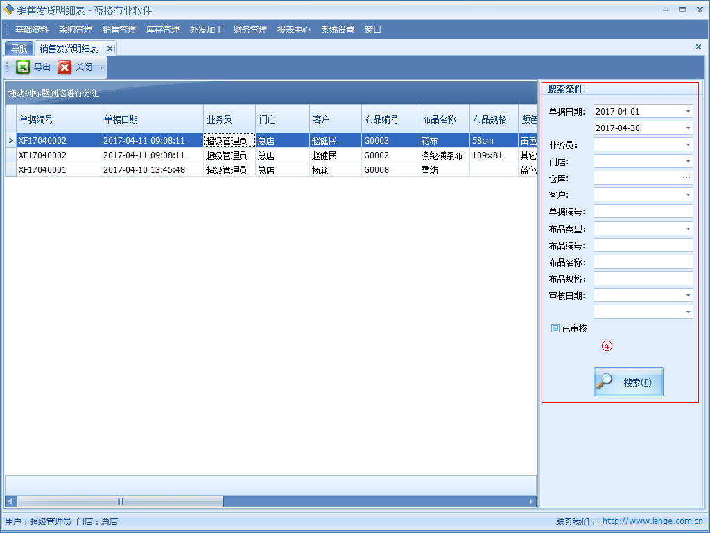 傲藍(lán)布業(yè)軟件銷售發(fā)貨明細(xì)表:記錄所有的銷售發(fā)貨記錄。在表中詳細(xì)記錄了銷售日期,業(yè)務(wù)員,門店,客戶,布品編號,布品名稱,布品規(guī)格,顏色,單價(jià),數(shù)量,售出總價(jià)等信息。