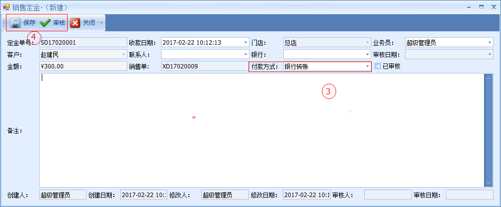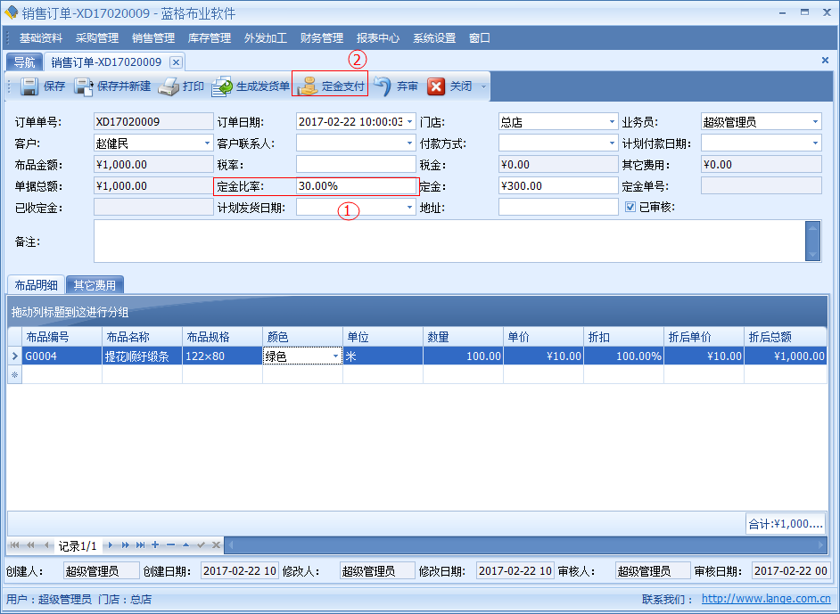 如需要為這張銷售訂單收取定金,在定金欄上填寫相應(yīng)的定金金額或在定金比例欄上填寫相應(yīng)的比例。具體操作步驟如下圖: