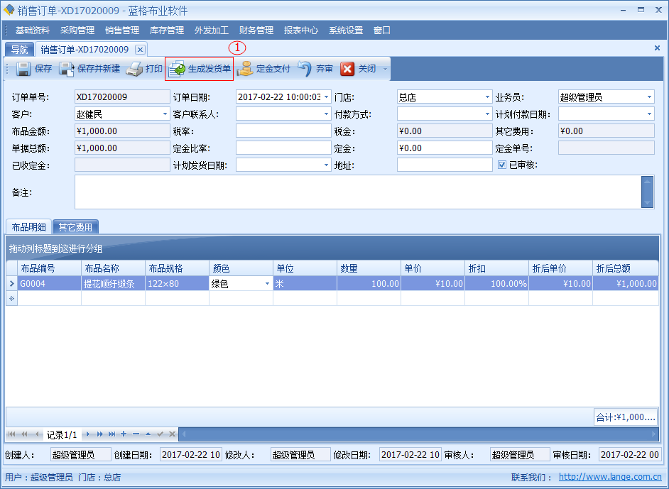 在傲藍(lán)布料管理軟件中審核好的銷售訂單則確定該單據(jù)生效并且該單據(jù)以后不能進(jìn)行修改,根據(jù)銷售訂單可以生成銷售出庫(kù)單,同時(shí)也可以對(duì)該單據(jù)進(jìn)行一個(gè)定金支付登記。銷售訂單也可根據(jù)前面填寫的銷售報(bào)價(jià)單進(jìn)行生成,在銷售報(bào)價(jià)單點(diǎn)擊生產(chǎn)銷售訂單即可。