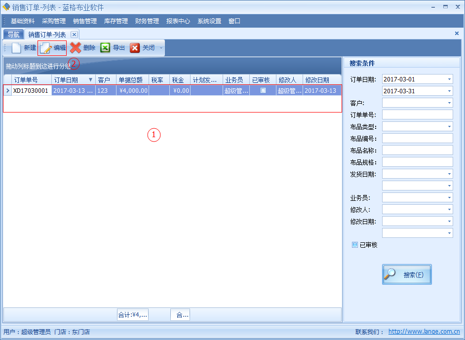 如需要對(duì)銷售訂單某一條數(shù)據(jù)進(jìn)行修改的,通過銷售訂單列表選中一條記錄點(diǎn)擊【編輯】按鈕,進(jìn)入
