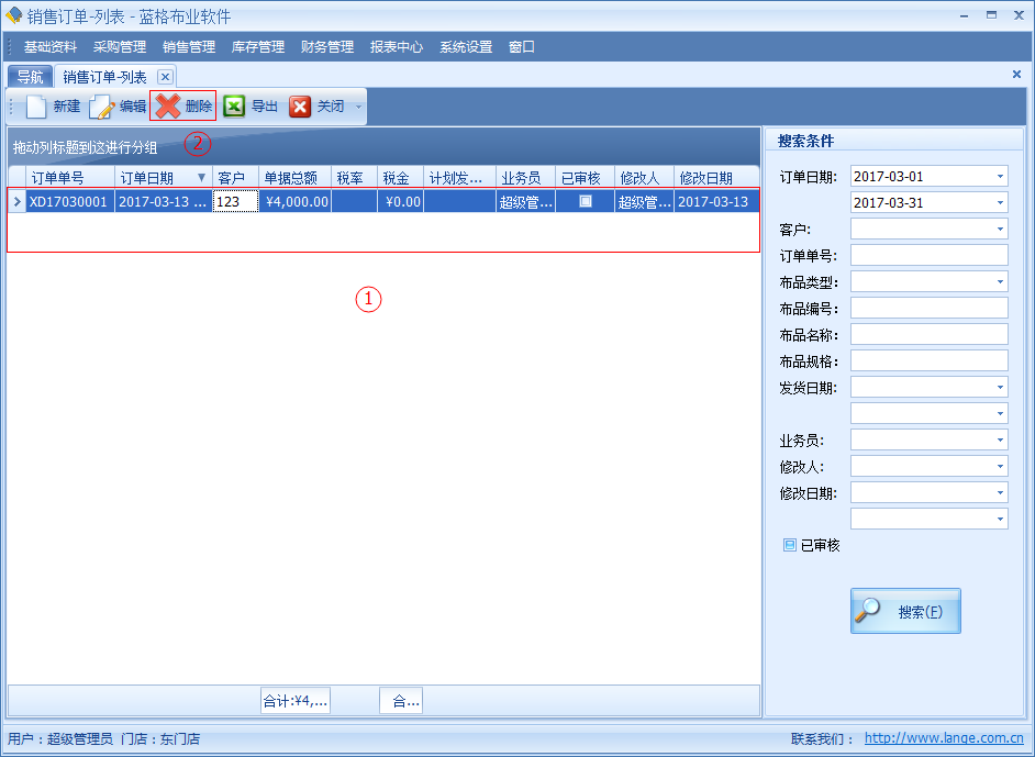 如需要對(duì)銷售訂單中某一條數(shù)據(jù)進(jìn)行刪除的,通過銷售訂單列表選中一條記錄點(diǎn)擊【刪除】按鈕,刪