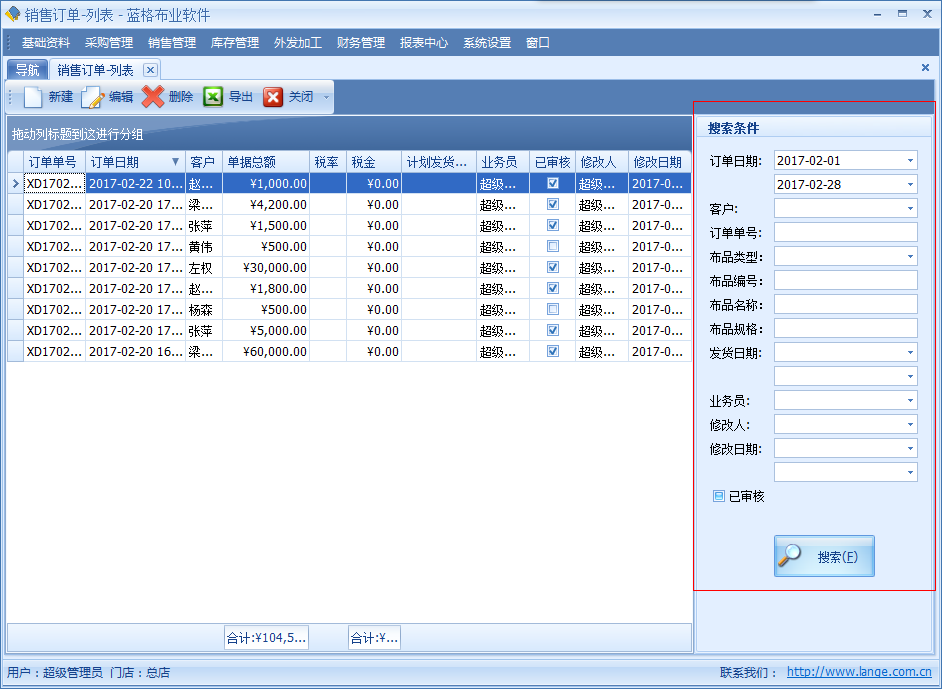 ○1 通過訂單編號(hào)或者客戶,布品名稱等方式查詢列表。 如下圖: