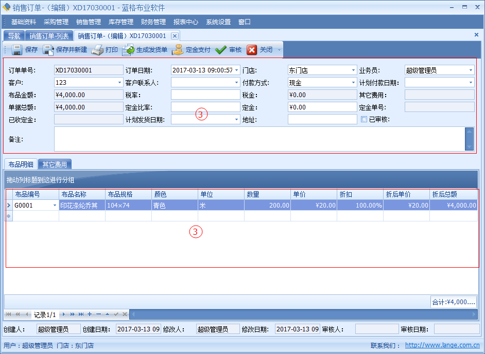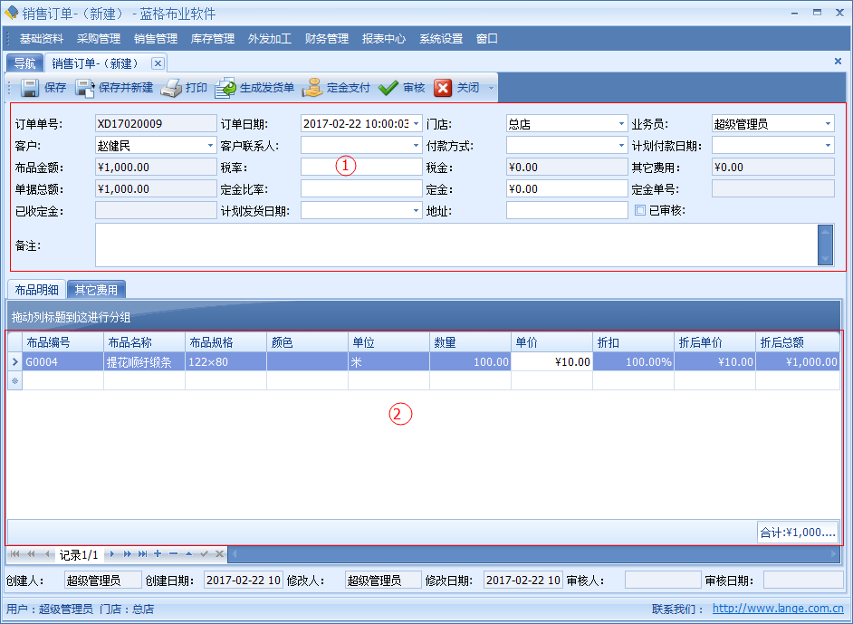 傲藍(lán)布料銷售軟件銷售訂單管理,銷售訂單主要是用于,銷售時(shí)按照客戶所需要的布品,進(jìn)行登記。在銷售訂單中錄入銷售訂單,銷售訂單的信息包括開單日期、客戶、聯(lián)系人、付款方式、金額、定金、稅率、稅金等信息。明細(xì)數(shù)據(jù)中是該單據(jù)銷售布品名稱,顏色,單位,數(shù)量?jī)r(jià)格等詳細(xì)數(shù)據(jù)。