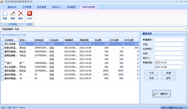 點擊【業(yè)務(wù)管理】->【銷售列表】, 打開銷售單據(jù)列表界面,該界面可以進(jìn)行查詢,查詢相關(guān)銷售單的信息,雙擊該單據(jù)打開銷售詳細(xì)信息界面。銷售單據(jù)列表界面包括編輯銷售單,刪除單據(jù)和建立新的單據(jù)三個功能。如下圖: