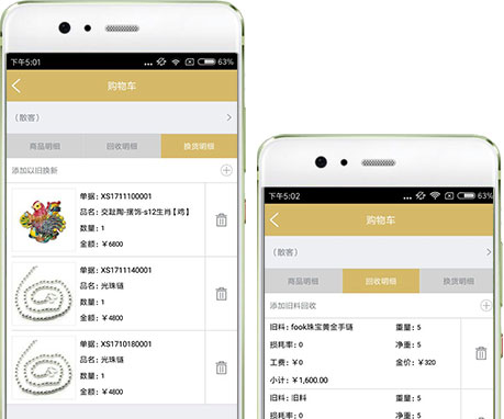 用傲藍(lán)珠寶店管理APP,銷售人員在手機(jī)上就可以完成黃金、K金等舊料的回收,按重自動(dòng)計(jì)算回收金額。