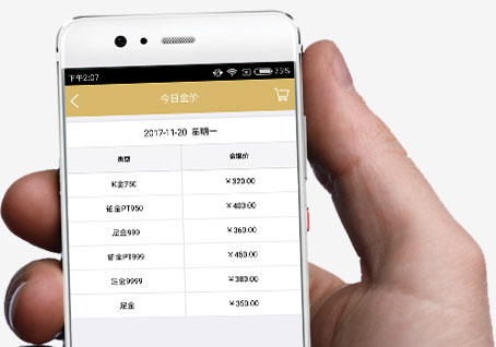 APP每日自動(dòng)更新K金、黃金、鉑金、白銀等首飾商品的每克單價(jià)。銷售人員可以通過APP隨時(shí)查詢,銷售或回收相關(guān)產(chǎn)品時(shí)自動(dòng)根據(jù)商品重量按單價(jià)計(jì)算商品價(jià)格。