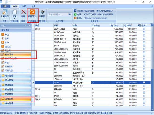 傲藍(lán)建筑租賃管理軟件從模板批量導(dǎo)入材料/設(shè)備數(shù)據(jù)