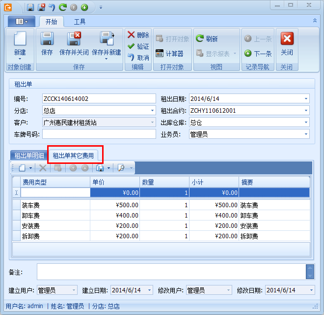在建筑材料或者建筑機械設備租出的過程中,少不免會產(chǎn)生各類其它費用,例如裝車費,卸車費,安裝費,拆卸費等等。如何在傲藍鋼管扣件租賃計費軟件上添加并在明細報表上體現(xiàn)這些費用呢。可以通過傲藍鋼管扣件租賃計費軟件的租出單,回收單,租入單,歸還單等單據(jù)上都有一個添加其它費用的選項(如圖)