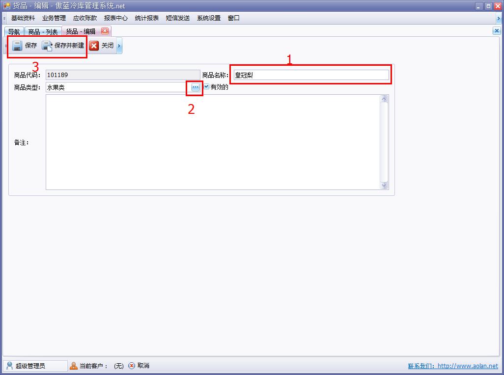 傲藍(lán)冷庫(kù)信息管理系統(tǒng)對(duì)于貨品資料的建檔管理,以便于業(yè)務(wù)操作時(shí)的選擇自動(dòng)生成,例如入庫(kù)單操作,選擇所要入庫(kù)的商品即可,免除了人為重新錄入的繁瑣。
