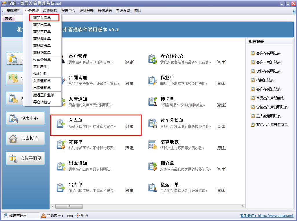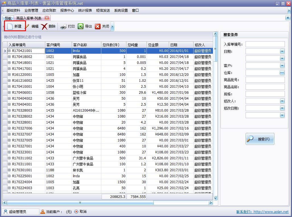 傲藍(lán)冷庫倉儲(chǔ)管理軟件,商品入庫功能,系統(tǒng)可分倉庫,按照商品批號(hào)管理,自動(dòng)計(jì)算操作費(fèi)用。系統(tǒng)采用冷藏費(fèi)和操作費(fèi)分離計(jì)算的方式。