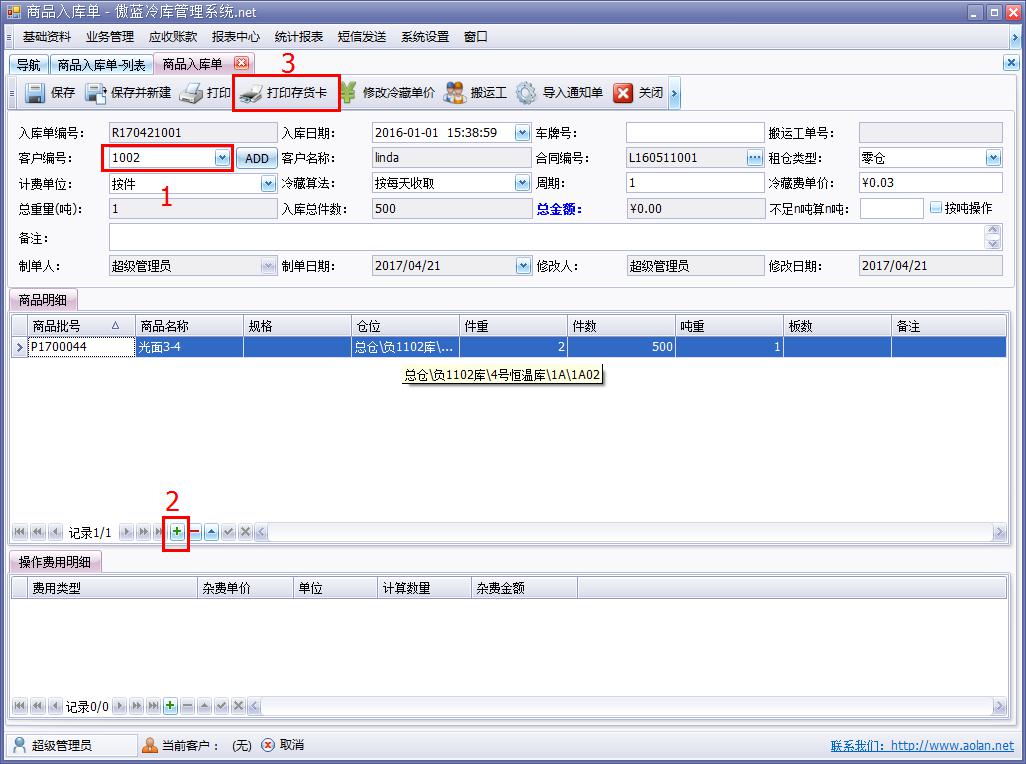步:選擇要入庫的客戶,第二步:添加要入庫的商品,填寫好入庫信息保存后,第三步:把存貨卡打印給客戶,如圖: