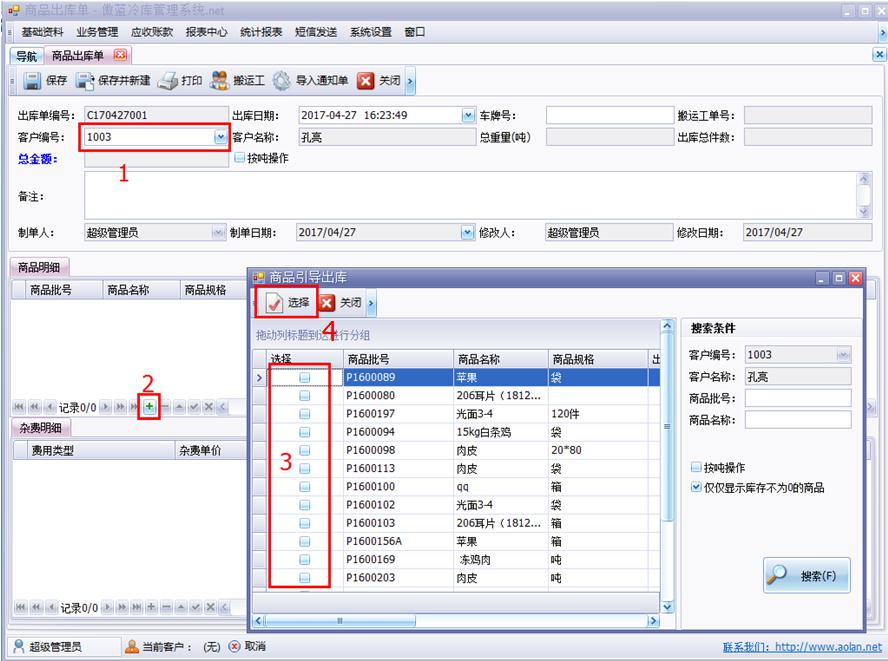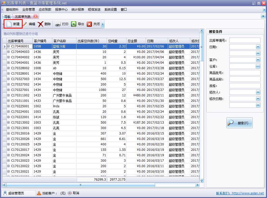 傲藍冷庫倉儲管理軟件,商品出庫單,對指定的商品批號或者商品編號進行出庫,此模塊顯示當前批號商品的存貨件數、存貨噸重,出庫的噸重不能超過存貨噸重。