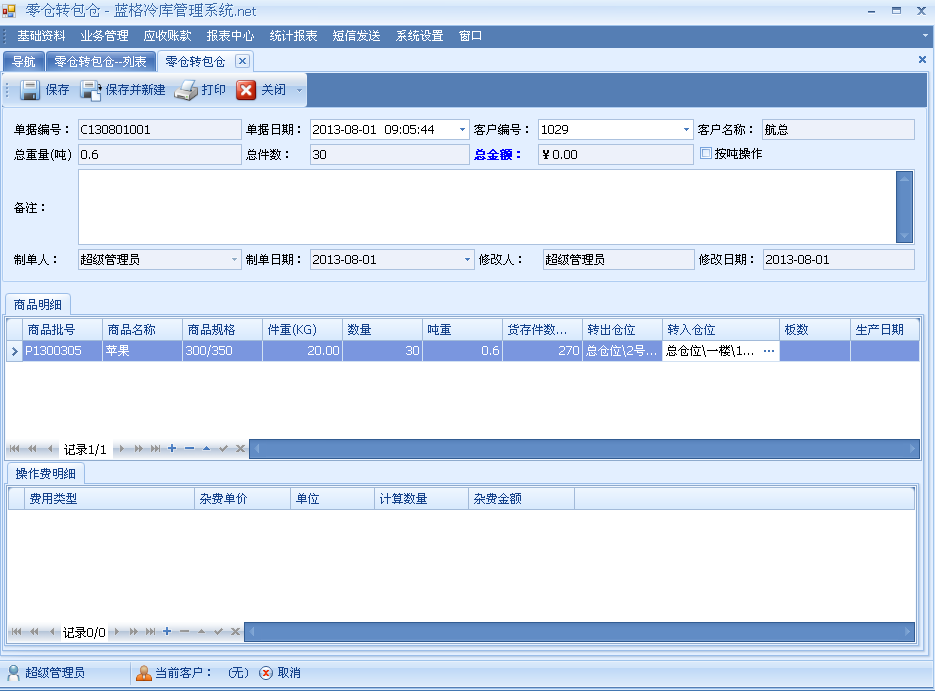 零倉(cāng)轉(zhuǎn)包倉(cāng)操作點(diǎn)擊,點(diǎn)擊冷庫(kù)管理軟件的業(yè)務(wù)管理的“零倉(cāng)轉(zhuǎn)包倉(cāng)”選擇需要轉(zhuǎn)倉(cāng)的時(shí)間和貨主商品批號(hào)和件數(shù),保存即可。如圖操作: