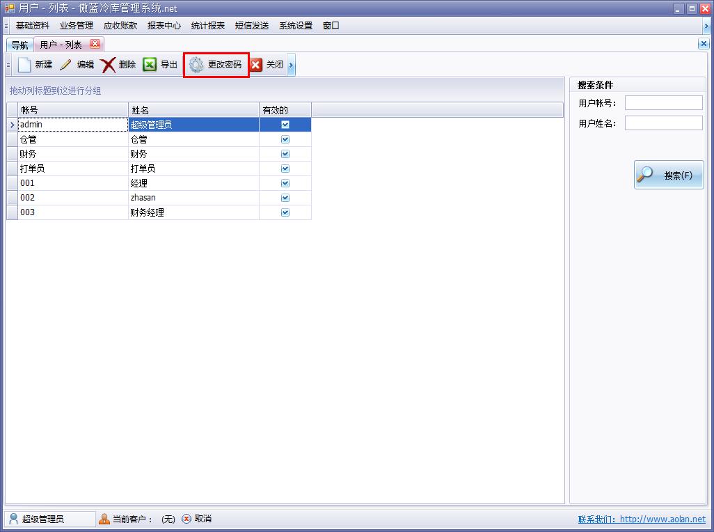 例如,系統(tǒng)的個(gè)別用戶(hù)離職,為了保障不必要的數(shù)據(jù)流失,或者避免惡意破壞冷庫(kù)管理軟件數(shù)據(jù)的情況出現(xiàn),管理員可修改此離職用戶(hù)的登錄密碼,性禁止此用戶(hù)登錄系統(tǒng)。