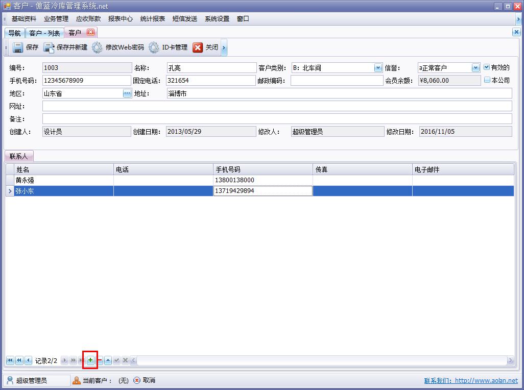 傲藍(lán)冷庫信息管理系統(tǒng),管理貨主資料以及多聯(lián)系人/聯(lián)系方式