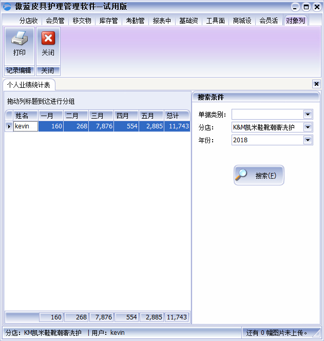 傲藍皮具護理店連鎖軟件提供個人業(yè)績統(tǒng)計報表功能,根據(jù)不同的業(yè)務(wù)類型以及門店,快速檢索員工的個人業(yè)績情況。