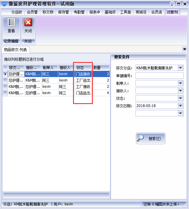 ④皮革物品移交流程完成之后,還可以在傲藍(lán)皮具修理店收銀軟件中【移交皮革物品】→【移交記錄】中的皮革物品移交列表中可以清晰的看到門店和工廠的皮革物品數(shù)量,皮革物品移交的當(dāng)前狀態(tài),有多少皮革物品已經(jīng)洗好移交,還有多少在工廠皮革護(hù)理,使皮革護(hù)理店務(wù)管理更加簡潔清晰。皮革物品移交列表如圖: