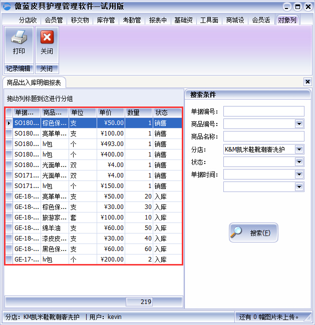 彈出商品出入庫明細(xì)報(bào)表就可以查看到商品狀態(tài)及明細(xì)還可以打印,此外,還可以根據(jù)商品的資料或出入庫的時(shí)間進(jìn)行查詢,更精細(xì)化的監(jiān)控好商品出入庫的情況,全面管理整個皮具護(hù)理店鋪。如圖: