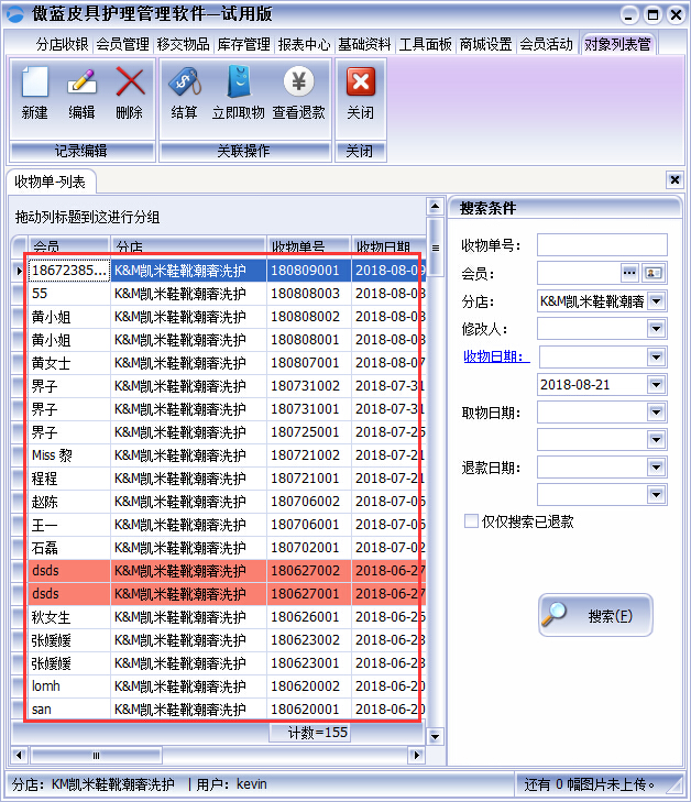 收物單是會(huì)自動(dòng)保存當(dāng)前登錄皮具護(hù)理店,在收物物單列表界面中可以搜索每個(gè)分店的收物單以及收物單信息,雙擊皮具護(hù)理店連鎖管理軟件選擇單據(jù)就可以打開該收物單查看到衣物明細(xì)來記錄。