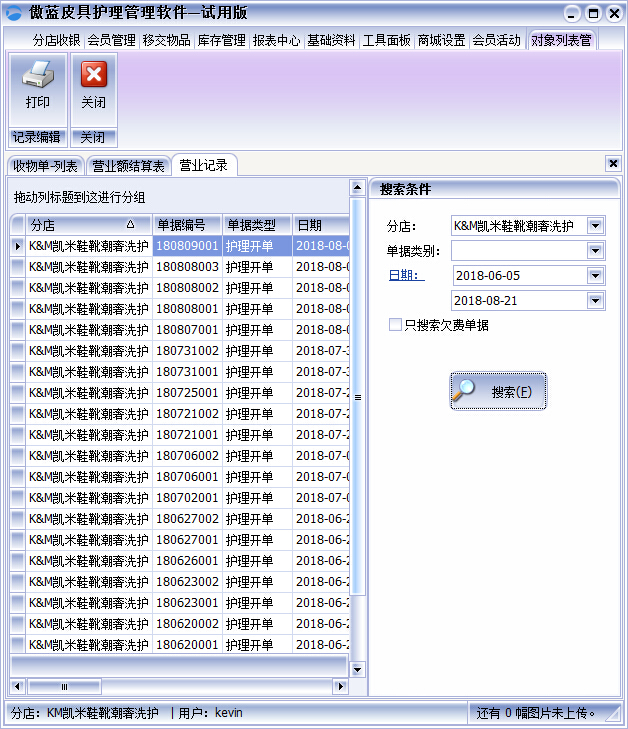 皮具護(hù)理店連鎖管理軟件在【報(bào)表中心】【營業(yè)記錄】表中可以根據(jù)分店搜索每個(gè)分店的單據(jù)付款信息。