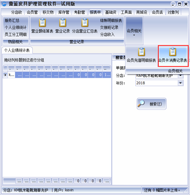 1、打開傲藍(lán)皮具護(hù)理門店管理軟件,點(diǎn)擊【報(bào)表中心】欄目,找到【會(huì)員相關(guān)】下的“會(huì)員卡消費(fèi)記錄表”如圖: