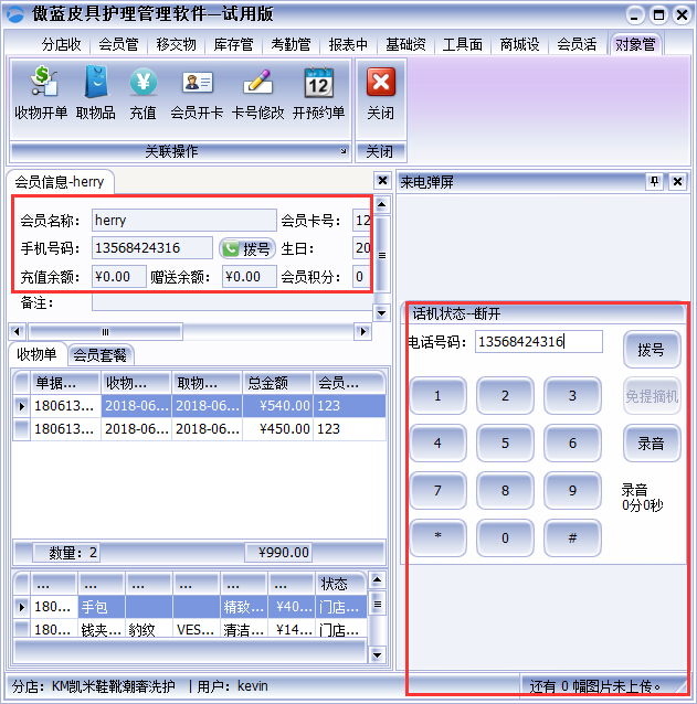 傲藍(lán)皮革保養(yǎng)店軟件電話預(yù)約操作,軟件支持接入來電寶,會(huì)員打電話到門店時(shí),軟件會(huì)自動(dòng)設(shè)別來電號(hào)碼,彈出會(huì)員的信息,無需再詢問來電客戶的信息再進(jìn)行下一步工作,提高了工作效率。
