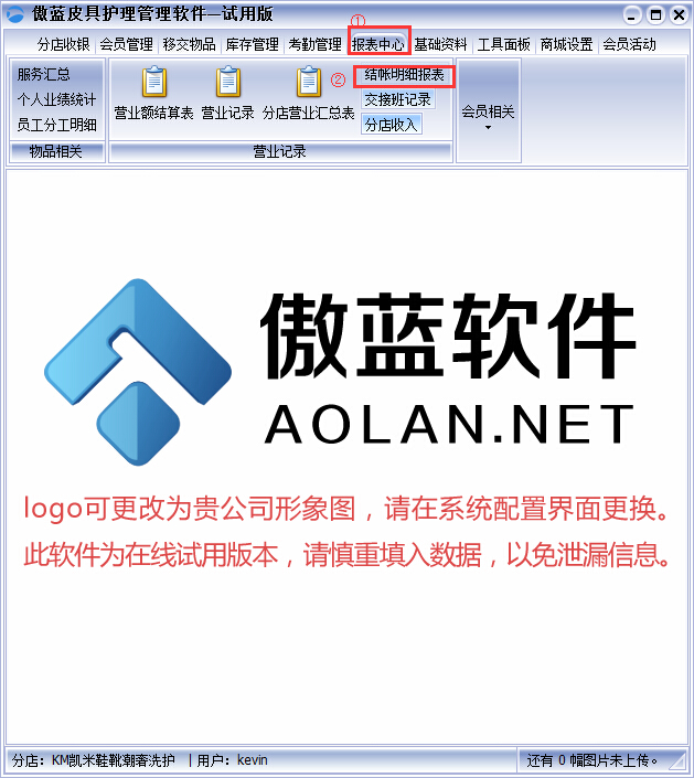 1、首先登錄傲藍(lán)皮具護(hù)理店財(cái)務(wù)管理軟件界面,點(diǎn)擊上部導(dǎo)航的【報(bào)表中心】,轉(zhuǎn)入報(bào)表中心功能列表。點(diǎn)擊后,查找皮具護(hù)理店財(cái)務(wù)管理軟件的中部菜單欄上的【結(jié)賬明細(xì)報(bào)表】,點(diǎn)擊進(jìn)入。
