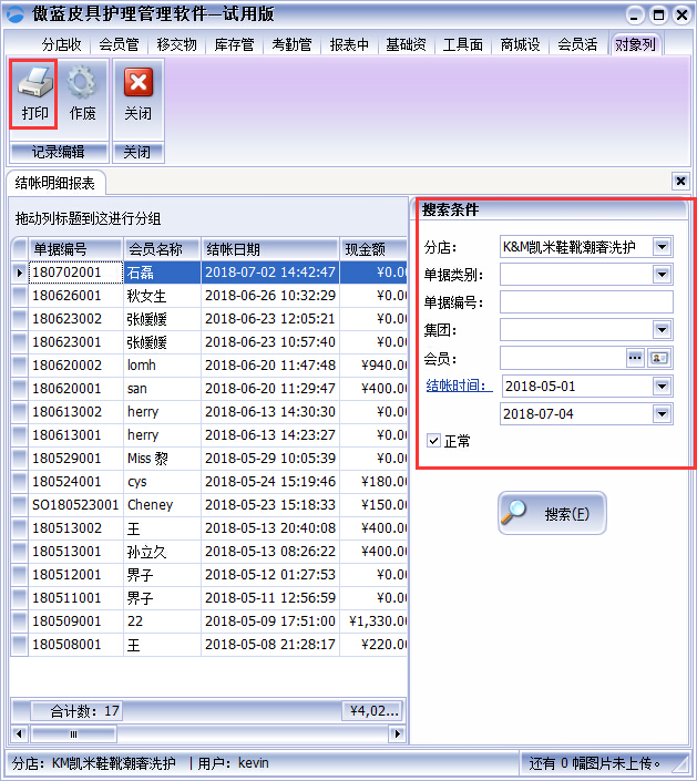 2、在報(bào)表右面的搜索條件那里查找特定條件的營(yíng)業(yè)額結(jié)賬單據(jù)明細(xì)。方便用戶查看。還可以進(jìn)行打印和作廢。如圖所示: