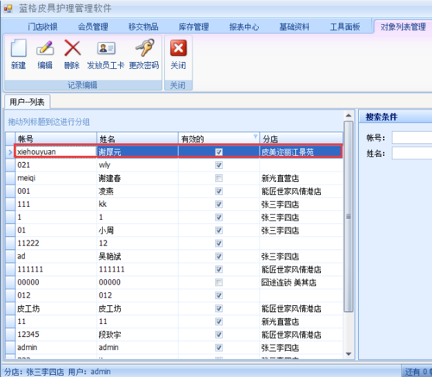 4、界面保存后,退出到傲藍(lán)皮具店連鎖管理軟件用戶列表界面,點擊搜索,就可以看到剛才添加的用戶了。