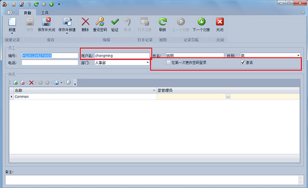 第2步、點(diǎn)擊工具欄的“新建”按鈕,彈出新建員工詳細(xì)界面,輸入員工姓名、用戶名(登錄賬號),密碼默認(rèn)為空,如果選中“次登錄修改密碼”,則在次登錄的時候會顯示修改密碼對話框。選中“激活”表示員工能夠登錄系統(tǒng),否則員工不能登錄系統(tǒng)。