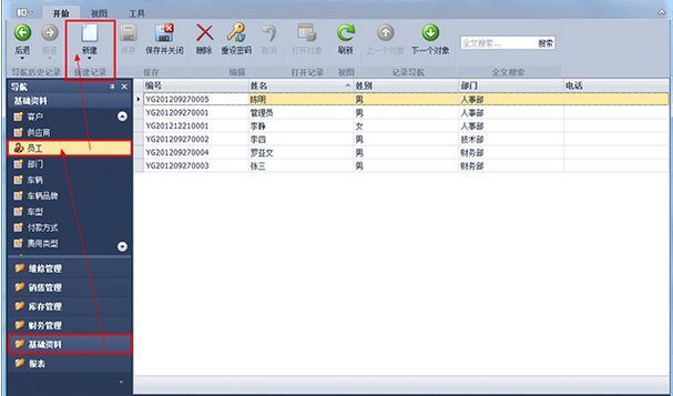 第1步、登錄傲藍(lán)汽車維修管理系統(tǒng),點(diǎn)擊“基礎(chǔ)資料”-“員工”,出現(xiàn)員工列表界面。