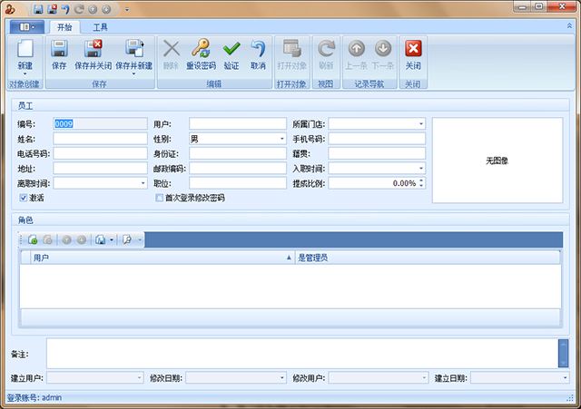 2. 點(diǎn)擊工具欄的“新建”按鈕,會(huì)彈出新建員工窗口,填寫員工相關(guān)的信息和員工的登錄用戶名即可,如果選中“首次登錄修改密碼”,那么員工在首次登錄的時(shí)候會(huì)彈出一個(gè)修改密碼的對(duì)話框,如果沒有選中,那么密碼默認(rèn)為空。